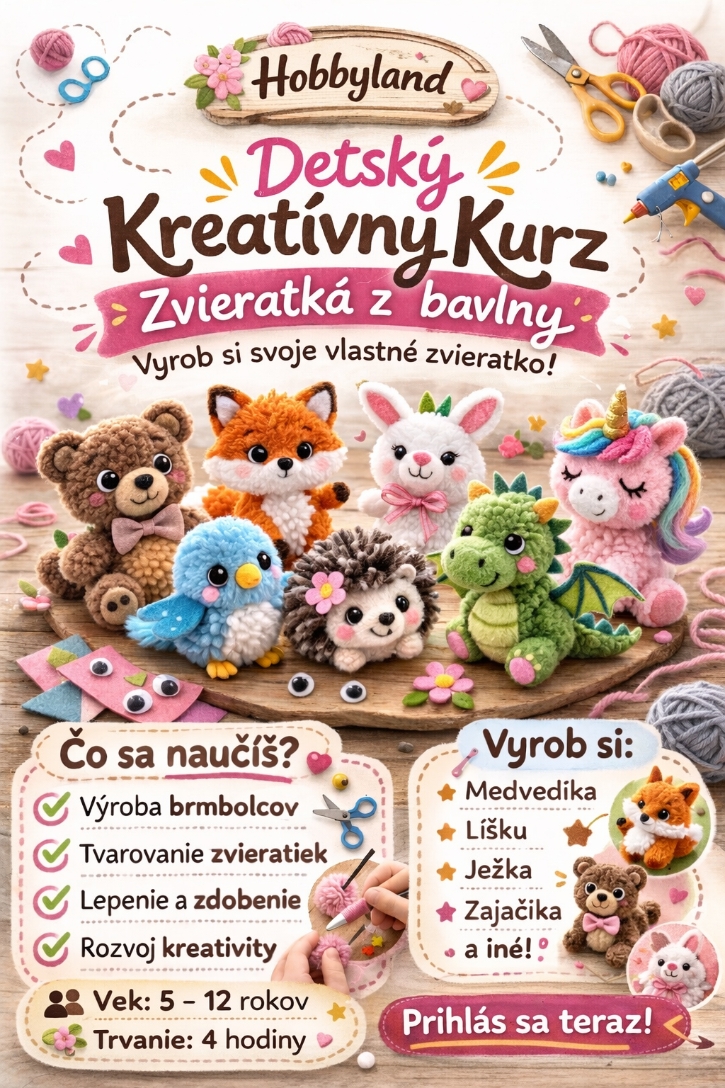 Cieľ kurzu: rozvoj jemnej motoriky, podpora kreativity a fantázie, tréning trpezlivosti, radosť z vlastnoručne vyrobeného zvieratka